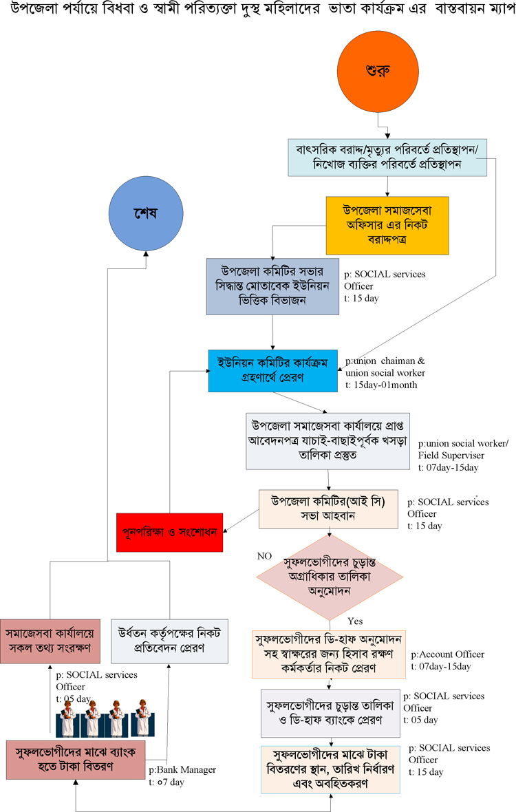 | ১ | উপজেলা পর্যায়ে বিধবা ও স্বা্মী পরিত্যাক্ত দুস্থ মহিলাদের ভাতা কার্যক্রমের বাস্তবায়ন | দেখুন | |